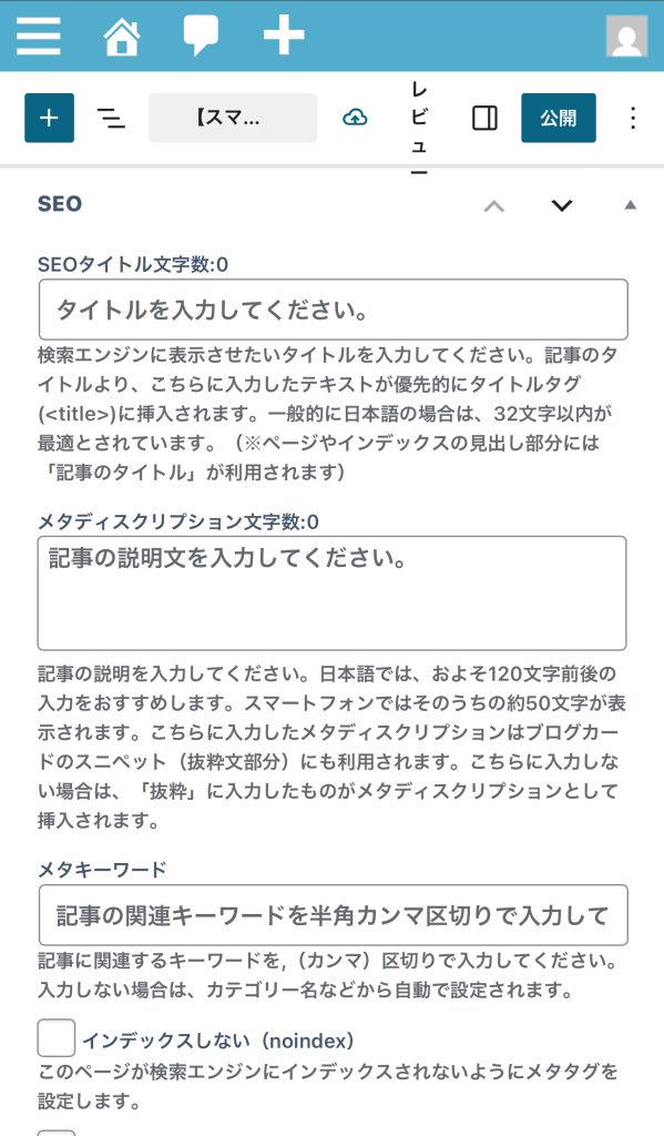 - SEO プラグインを使っている場合は、それぞれのプラグインの設定画面で設定できます。